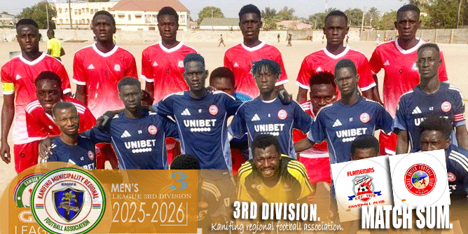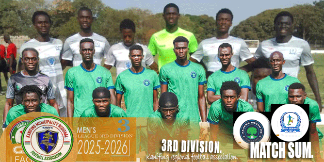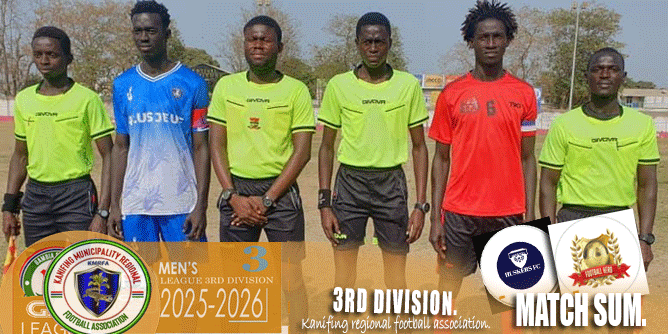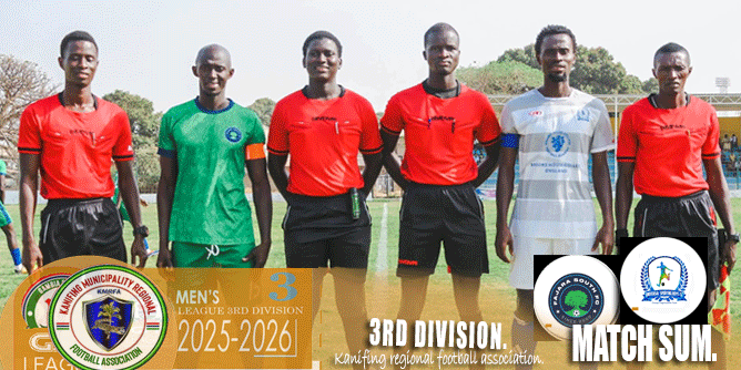 At the Bakau Mini Stadium, Fajara South FC defeated Universal Sporting Boys FC 2–1. Sorrie Barry (#10) scored in the 30th minute, Ousman Sanyang (#15) converted a penalty in the 40th minute, and Yankuba Sanneh (#13) pulled one back in stoppage time (90+3’).